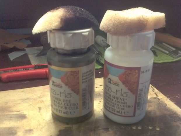 Usar esponjas para aplicar capas de piel de venado de cuero (no), dejó todas manos secas antes de comenzar la siguiente capa. 1 º capa cena shene cuero acabado 2 º capa marrón tinte de cuero (exceso de esponja, que deje secar trapo.) 3 º otra capa pesada de shene de cena. 3 capas total