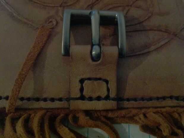 plegable 2x3\4in pedazo de cuero en media poner en 1 hebilla en doble puntas de correa va por la ranura previamente cortado, alinear el orificio de costura cuadrada con 7x3in pedazo de cuero. Ahora, usando aguja e hilo encerado coser el lazo junto de 2x3\4in & 7x3in piezas y corte wen hilo hecho.