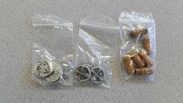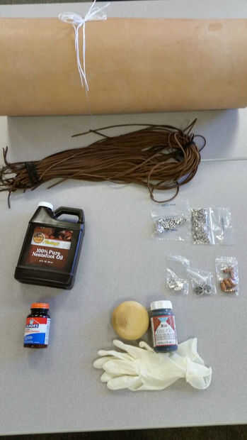 Paso 1: materiales Cortan dos piezas de cuero cortadas en un óvalo con la parte superiorPaso 2: materiales Cadena de cuero cerca de dos piesPaso 3: montaje Corte los orificios a lo largo de la parte exterior de los óvalos, colocar la cadena a través