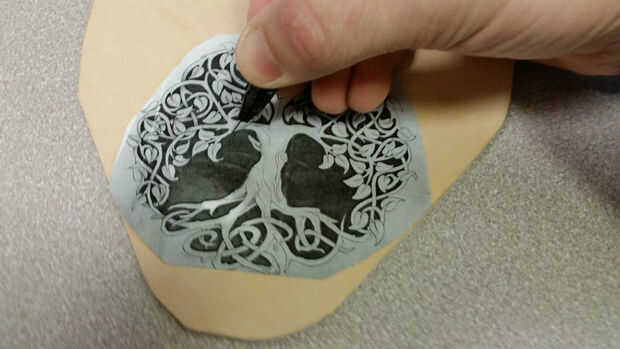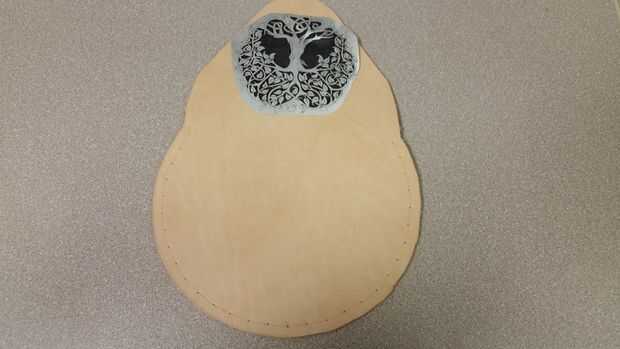 Opcional: Si desea añadir decoración a la tapa frontal, ahora es el momento. Mi primera bolsa he creado tenía una marca de ganado a través de la tapa frontal que no se dio cuenta hasta que comencé a cortar. Así estampado un diseño para la marca y ahora no puede decir.