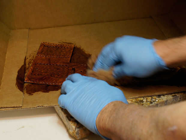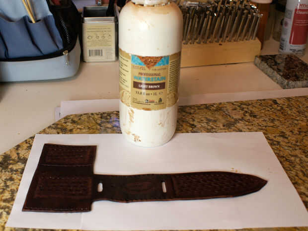Colocar cartón o varias capas de periódico para proteger el área de trabajo y absorber cualquier exceso colorante/tinte. Guante-up; solo queremos teñir el cuero no tu piel. Me gusta usar una caja de cartón para evitar cualquier posibilidad de tinte chapoteando en mi banco de trabajo. Vierta una pequeña cantidad de tinte (si usted derrama el tinte, tienes sólo una pequeña cantidad para limpiar) en un plato de plástico o vidrio (nunca de metal). Usar Professional Waterstain® de Tandy que he probado otros, pero funciona mejor para mí; fácil de aplicar, incluso manchas, etc.. Utilice un dauber, esponja o trozo de lana para aplicar el tinte en el cuero. No vierta el tinte directamente sobre el cuero. Dejo una mancha oscura donde primero hace contacto. Trabajar el tinte en la piel en un movimiento circular uniformemente cubriendo toda la pieza. Asegúrese de obtener los bordes y en todas las impresiones de sello. Es una preferencia personal, pero tinte el lado de la piel también. Su proyecto; su elección. Limpie el exceso de tinte con una toalla de papel limpia. Si desea un poco más oscuro que el color permite la primera capa reposar unos minutos y aplicar otra capa. Una vez seco, pulimente la superficie con un paño suave para quitar cualquier pigmento suelto primero aplique una capa de Eco-Flo Super Shene® u otro sellador. Esto evitará que el tinte viene de las manos durante la costura y el accesorio de hardware. Otra vez, todo debe estar seco antes de pasar al siguiente paso.