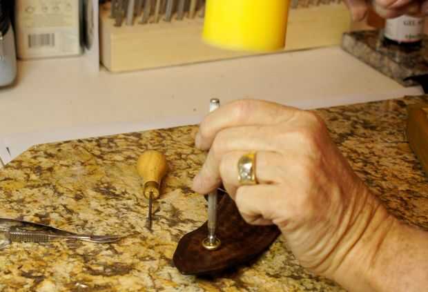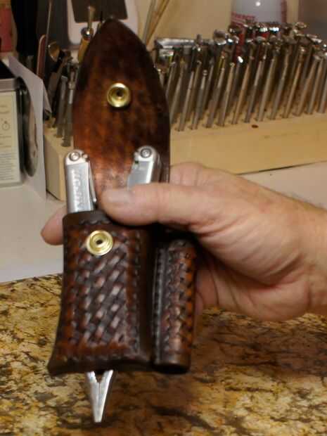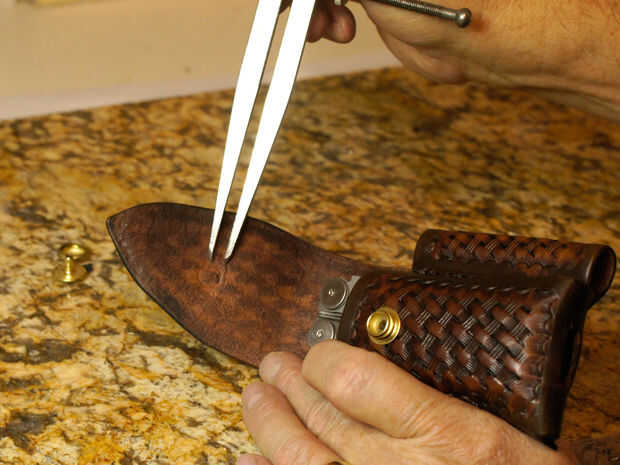 Inserte el Leatherman® en la bolsa, de modo que presiona contra la parte inferior. Plegar la solapa de la herramienta, tire hacia abajo firmemente. Céntrelo y presiona la piel firmemente contra el cierre que sobresale. Dejará una marca en la parte inferior de la aleta. Verifique que el orificio se centrarán en la solapa y perfore un orificio de 1/8"; fijar el cierre con un yunque snap-establecedor y cóncavo.