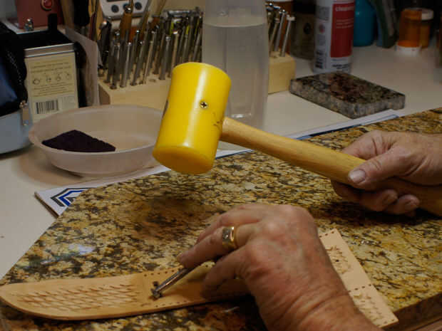 Utilizar un divisor de ala o lápiz para marcar ligeramente los bordes para su diseño. (Si no vas a sello o tallar un diseño en la bolsa, omita este paso). Usé un X511 armadura de cesta, estampado en diagonal, para crear el patrón y bordeado con un sello de C432 camuflaje para cubrir las marcas de mi frontera. Volver a caja el cuero si se pone un poco seco. Obtendrás mejores impresiones. Ah y tenga cuidado de no para golpear la armadura de cesta demasiado duro de herramientas de punzonar o perforará los bordes de la piel. Luz varios golpecitos mientras se inclina la herramienta funciona mejor que un solo golpe fuerte de lado a lado.