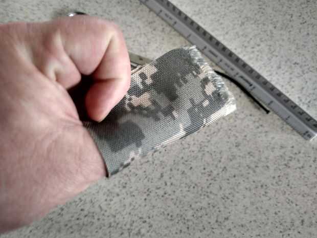 La cordura se mide aproximadamente 5 X 5. Lo que realmente hice fue envolver mi pulgar con una pulgada más o menos de material en los lados. El término técnico es echando un vistazo.
