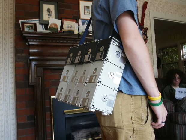este es un bolso que hice de disquetes. Encontré más de disquetes en un contenedor de basura y quería hacer correo armadura fuera de él (que es mi próximo proyecto de disco) me enteré que una bolsa es una gran prueba de proyecto de concepto. Aquí va...
