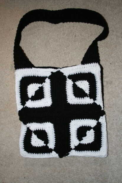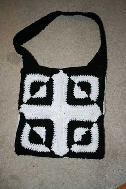 me ha gustado mucho mi primer bolso de mano de efectos especiales tanto que hice uno para mí. (Mi original blanco y negro uno era para un amigo). El patrón aparece en Ene/Feb ' 08 Crochet hoy! La revista y utiliza rojo corazón Super Saver: Borgoña y