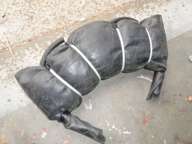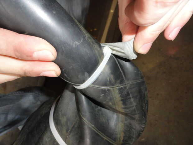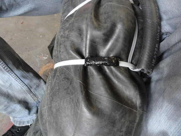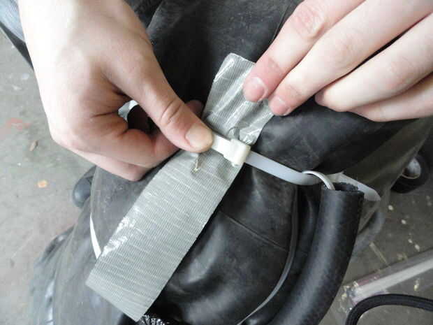Cuando todo está tan apretado como usted quisiera, seguir adelante y cortar los extremos extras de las ataduras de cremallera, corte hasta los talones. Debe deslizar los lazos zip a un punto donde el extremo cortado se oculta dentro de la manija. Finalmente, para evitar que corte lazos zip mientras que trabaja hacia fuera, utilice cinta adhesiva para cubrir en cualquier lugar que podría ser un peligro para la seguridad. Cubrimos los talones de los lazos zip que van alrededor de la bolsa para el mango bucle a bucle. También cubrimos la totalidad de los lazos zip utilizada para amarrar los rollos iniciales de los extremos de la bolsa.