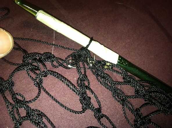 (patrón básico es 3 DC seguido por espacio de 2 CH). Únete a la cadena superior de 3 CH. No gire.