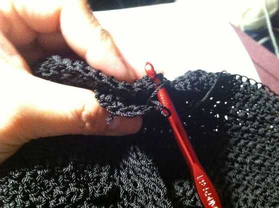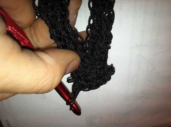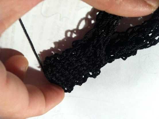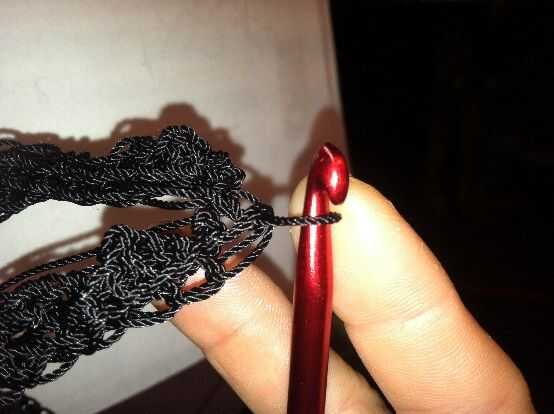 Inserte el gancho a través del siguiente bucles (ambos lazos de la correa) y SC. Repetir hasta 5 SC se crean que une los bordes de los extremos de la 2 correa. CH 1 y vuelta.