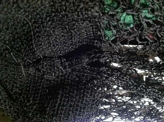 Termine. Nudo final pero deja una larga cola para ser utilizado para la fijación de las correas al fondo de la bolsa, así como para coser las costuras laterales. Hilado de nylon se desenreda fácilmente así que es mejor crear como pocos extremos como sea posible. Por esta razón, utilicé una cola larga de la correa para terminar las costuras de la bolsa.