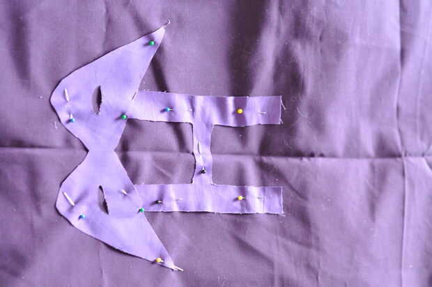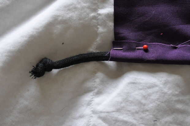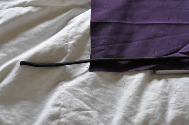 Luego, corte una longitud de cordón de lazo para la parte amplia de su rectángulo. Asegúrese de que es más largo de lo necesario para que se puede anudar el (probablemente utilicé unas 23 pulgadas). El lado de la tela con el diseño debe ser hacia abajo por lo que será la costura para el cordón en el interior. Doblar el extremo de la tela y precisar.