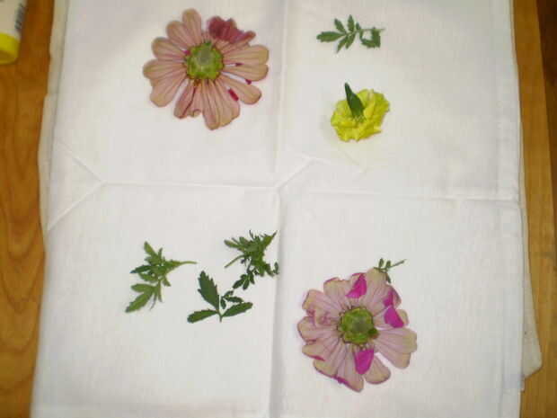 Toalla de té del doblez por la mitad. Coloque sobre una superficie dura. Arreglar flores y hojas, lado de color hacia abajo en un lado en la toalla.