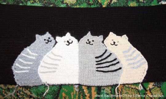 Entonces la tela entera se hace punto sc (solo negra). El color de fondo es de color negro. Todos los gatos son de diferentes colores. Hilado de textura diferente se ve particularmente decorativo, por ejemplo, puede utilizarse el hilo boucle para uno de los gatos. No olvide que el hilo debe ser del mismo espesor. Esto es importante!