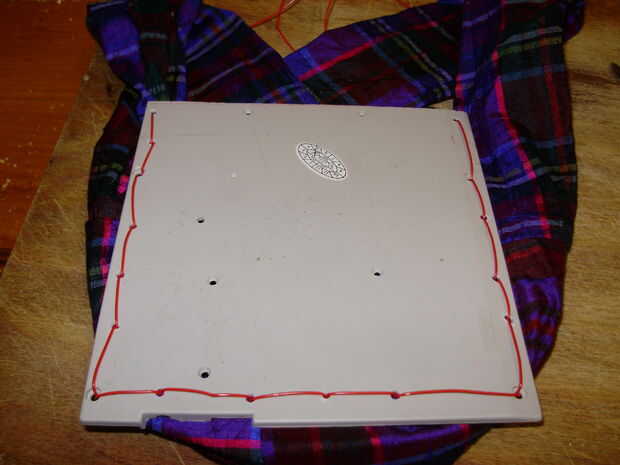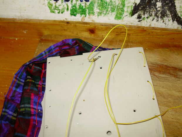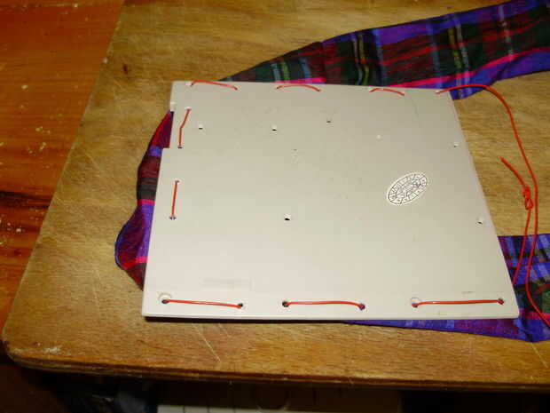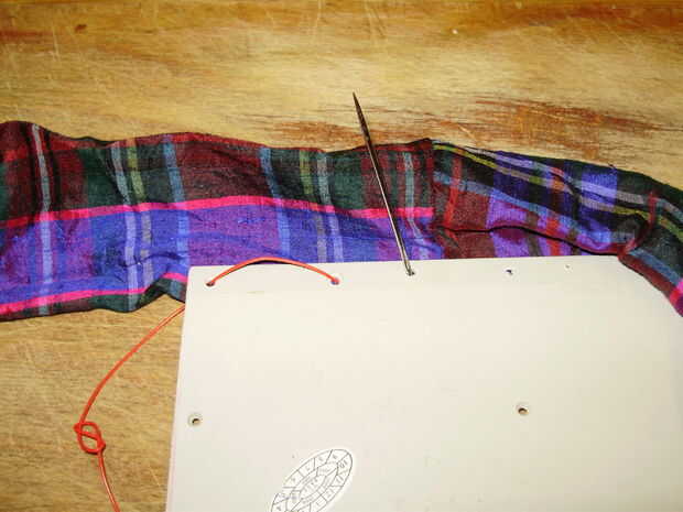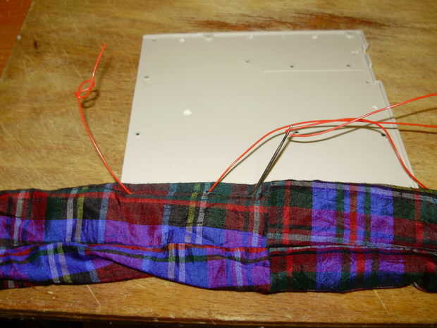 Cuando empiezas a coser, no tire el cable derecho a través de-necesita dejar una cola bastante larga para amarrar al final. Coser debajo y por encima hasta llegar al otro lado de la pieza frontal, luego vienen de nuevo otra vez llenando los huecos hasta que regreses a donde empezaste. Ahora Estire los puntos de sutura y unir los dos extremos en un nudo de arrecife (creo que se trata de un nudo cuadrado en los E.e.u.u.), o cualquier nudo que puede recordar cómo hacerlo.