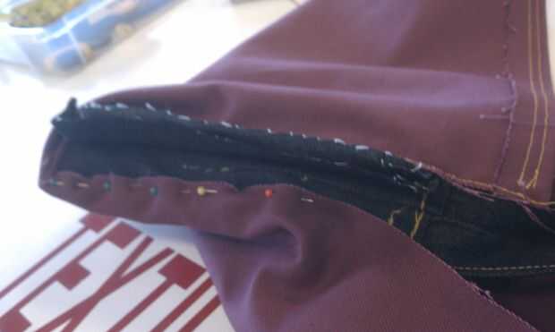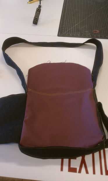 Ejecute la correa a lo largo de la parte inferior de la bolsa y el pin por el lado opuesto. He dejado suelto para colgar una chaqueta o sudadera de la parte inferior.