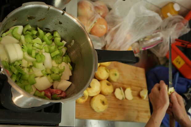 Aproximadamente, cortar cebollas, zanahorias, apio y las manzanas y agregar a la olla. Cubrir con agua y presión a cocinar por 3 horas o a fuego lento durante 8 horas. Añadir sal, pimienta, laurel y pimentón.