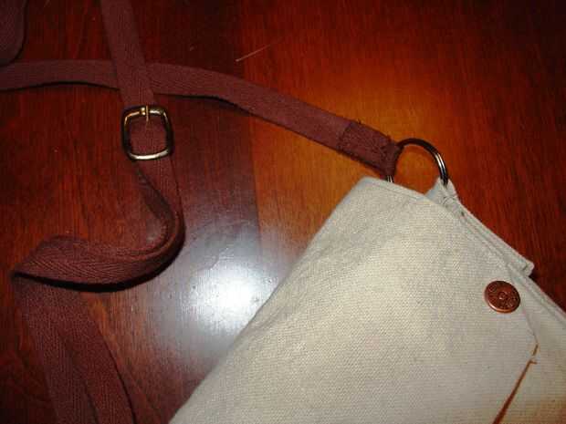 Luego, retirar la correa a través de uno de los anillos en el bolso y respaldo a través de la hebilla. Entonces, pase el extremo suelto al otro lado temporalmente. Ajuste la correa para que la hebilla se asienta en el centro de su pecho en una longitud cómoda. Corte el exceso en el otro extremo, el extremo debajo del doblez y coser abajo de modo que el doblez en la parte inferior. Con una correa tejida libremente como este, no necesita preocuparse de hacer un agujero para la lengüeta de la hebilla ya que se puede deslizar entre las roscas.