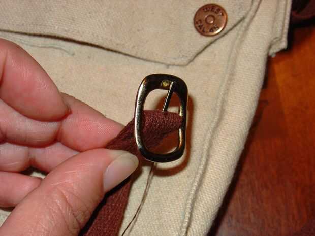 Remache de un extremo a la barra central de la hebilla. Pase la correa a través de uno de los anillos y respaldo a través de la hebilla.