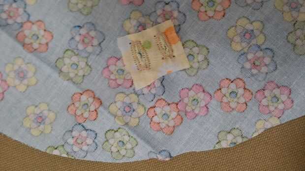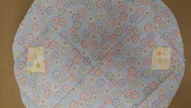 Ponga 2 trocitos de retazo en el reverso de uno de los círculos de tela grande, en la parte inferior de donde van los ojales. Esto ayudará a estabilizar a la tela mientras cose. Los ojales será 1-1/2" del borde exterior. Coser 2 aproximadamente 1/2" de distancia y luego la otra cosa dos en el lado opuesto del círculo.