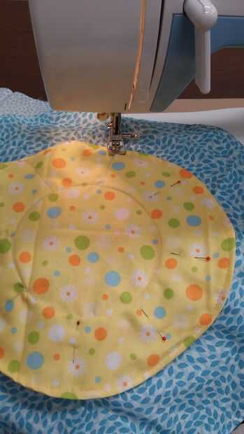 Lugar 8 alfileres alrededor del pequeño círculo, espaciados uniformemente, marcando las costuras de los bolsillos. Coser desde el borde de la cartulina en el borde exterior del círculo pequeño en todos los 8 lugares.