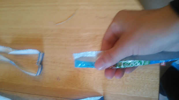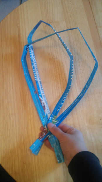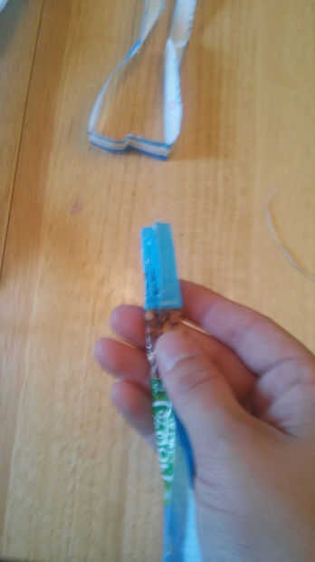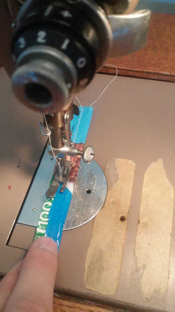 Luego tomó los pedazos y dobla en tercios, por último, coser todos juntos por el medio. El resultado me dio dos manijas grandes.