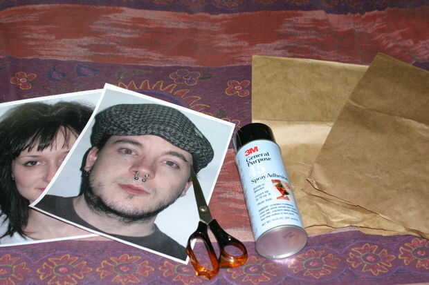 Necesita una impresora, tijeras, adhesivo en aerosol, objetos tales como cintas, botones... y una bolsa de papel. El primer paso es imprimir la foto de la cara deseada.