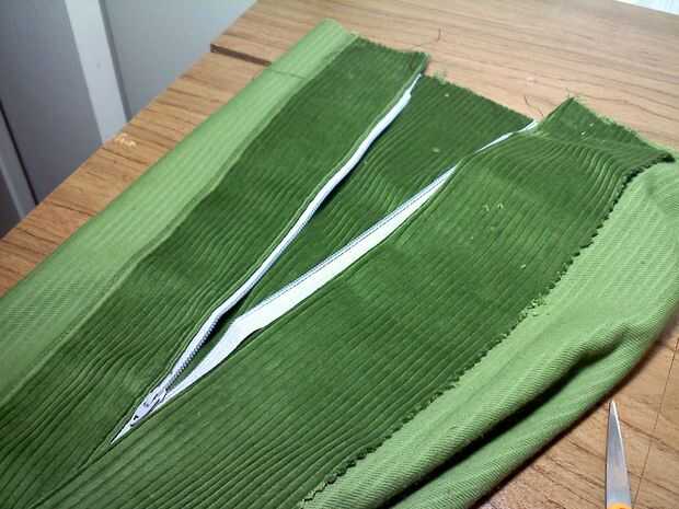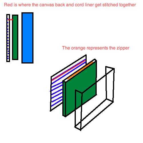 Porque mi laptop es bastante delgada fue capaz de salirse con el pana doblado por la mitad y los lados cosidos hacia arriba. Hace la forma del bolso básico pero necesitamos poner primero la cremallera. Nota sobre la cremallera... no funciona muy bien y estoy dispuesto a aconseja el que uso de botones. Si insistes en la cremallera, buena suerte. Botones pueden hacerse coser justo a la pana con un lazo de su hilo de rosca fuerte.
