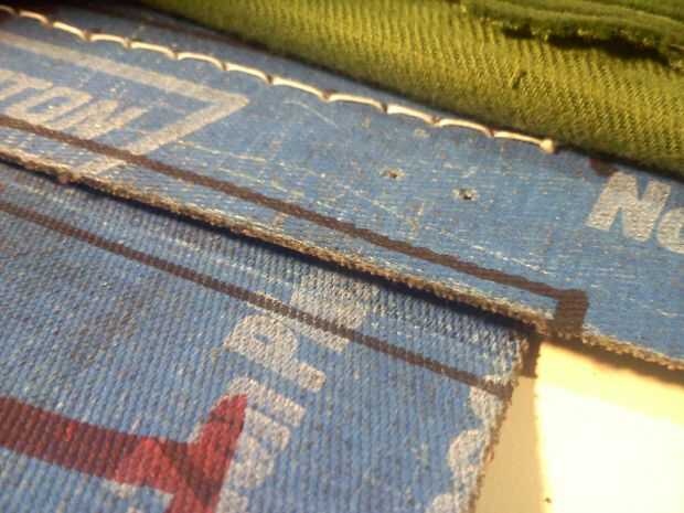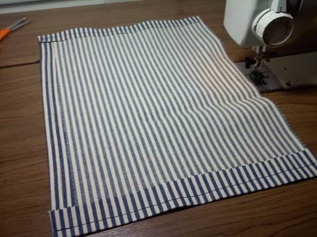 El cuadro uno demuestra la lona hacia atrás se cose a la membrana a lo largo del borde superior. Los bordes de la tela va cosidos a los bordes de la correa en el paso siguiente pero antes de hacerlo necesitamos para asegurarse de que la tela no simplemente desentrañar en los bordes. Perdonadme si ya lo sabes, pero tenemos que doblar la tela y coser abajo para crear un borde fuerte.