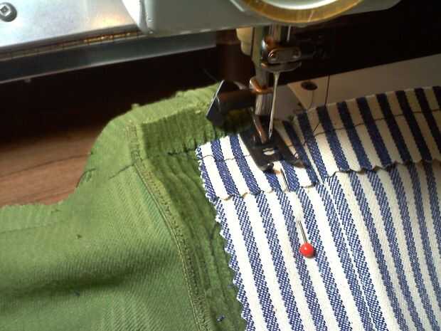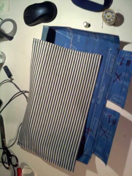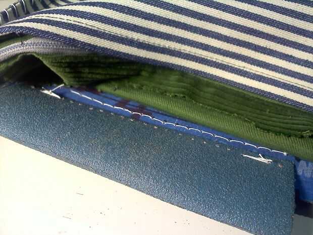Así que el objetivo es hacer un trazador de líneas y un panel trasero. La parte de atrás es la tela de rayas azul y el forro es la pana verde. El forro se cose a la lona trasera a lo largo del borde superior y cuelga perder dentro de la estructura creada por el cinturón cosido.