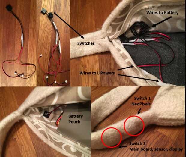Empalmado los interruptores táctiles en los cables de extensión JST para poder alimentar a los interruptores en la correa de la bolsa y fácilmente operarlos. Esto significa que el LiPowers todo el tiempo y energía se realiza a través de los interruptores de fácil acceso.
