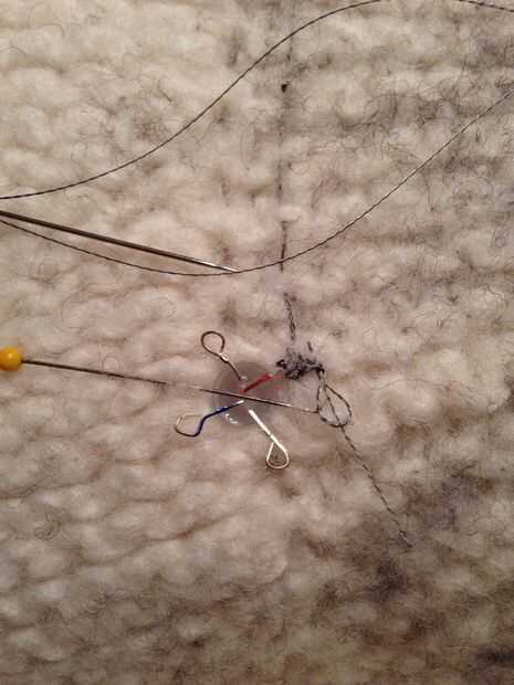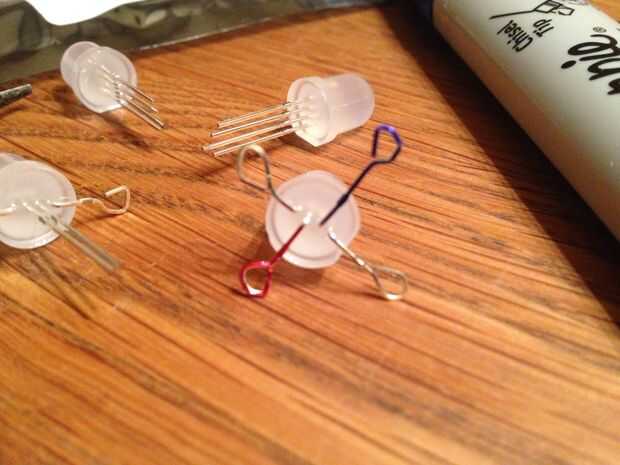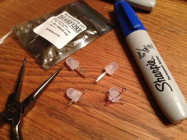 Estos NeoPixels no diseñan fácilmente para ser utilizado en accesorios personales. Sin embargo, es bastante fácil de modificar por lo que se cose en los proyectos. Use pinzas de punta de aguja para doblar las puntas en pequeños ojales, teniendo cuidado de que el seguimiento de los pernos. Para reducir la confusión acerca de cual pin es que marqué con sharpies (rojo para la energía y azul para la tierra - no podía encontrar mi sharpie negro...) y las clavijas de datos seguía sin marcar.