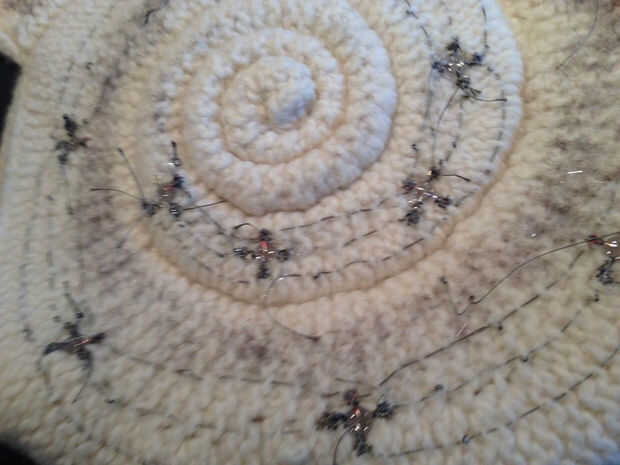 Una vez que los NeoPixels estén en su lugar es tiempo para el Lilipad y las fuentes de energía (ver esquema). En este punto es conveniente trabajar con pinzas antes de comprometerse con el hardware. A diferencia de la electrónica más tradicional, circuitos "cosidos" deshacer Haz muy desperdiciador de tiempo.