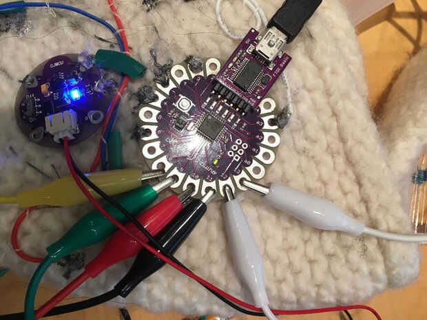 El tablero principal de Lilipad y el primer Lipower se colocan y cosido al bolso. Hilo conductor se utiliza para conectar los dos entre sí y a la NeoPixels al pin # 6 del gancho. Las conexiones donde el hilo conductor fue cortado o anudado se sella con pegamento caliente para garantizar las conexiones.
