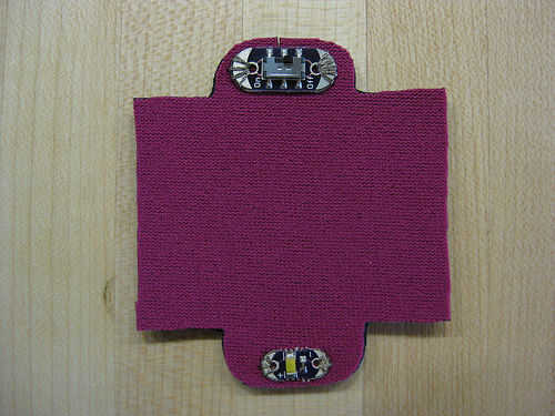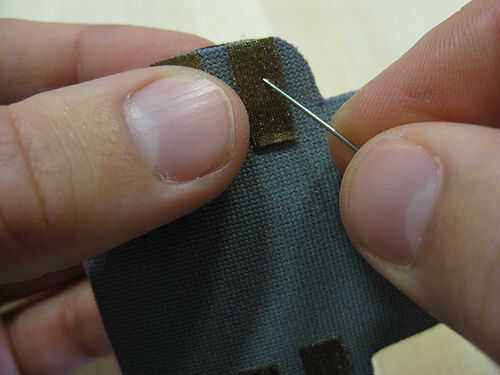 Enhebrar una aguja con hilo conductor, tomando el hilo doble. Mantener los componentes en su lugar y coserlas en firmemente al lado del neopreno del que será el exterior. El hilo conductor tiene que ir todo el camino a través del neopreno y sólo hacer contacto con el parche de tela conductora directamente detrás de él. Nunca haciendo contacto con ambos parches conductores. Para asegurar buen contacto coser por lo menos 3 - 4 veces por cada agujero. Corte el hilo conductor y a partir de nuevo después de cada hoyo. En este punto no importa que lado te ponga el interruptor o que el LED y también no importa que forma alrededor de uno de estos se montan.