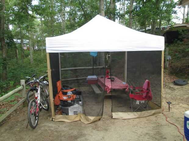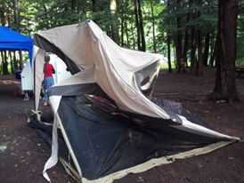 Voy a dejar aquí para que todos sepan la diferencia entre un toldo económico y durable. El toldo en la primera foto es un grado comercial EZ-up. Cuesta sobre $200, pero ha hecho un marco de acero más grueso y una estructura que ha durado muchos usos. El truco es soportes transversales que hacen de una forma más dentro de la parte superior del toldo, la cúspide es apoyada por un poste vertical en el medio, en lugar de cuatro postes plegables corriendo desde cada esquina.