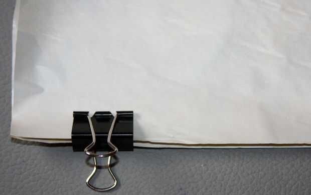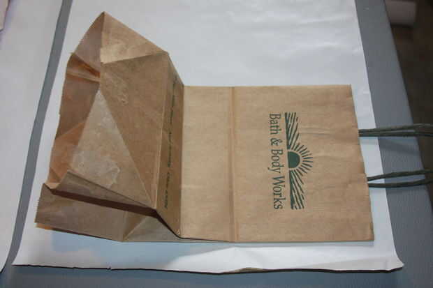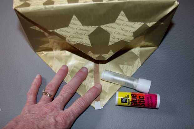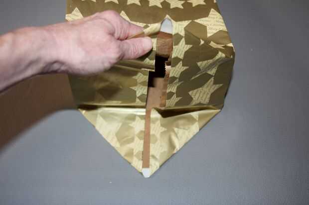 Utilizar los pliegues de la bolsa original como su guía y pliegue el papel de embalaje de la misma dirección. Adhiera la solapa inferior firmemente presionando fuertemente con la mano en el interior. Mis alumnos me dicen con frecuencia: el pegamento no funciona! Contesto "que no ha presionado lo suficientemente duro" como sé que el secreto de la buena adherencia es presión.