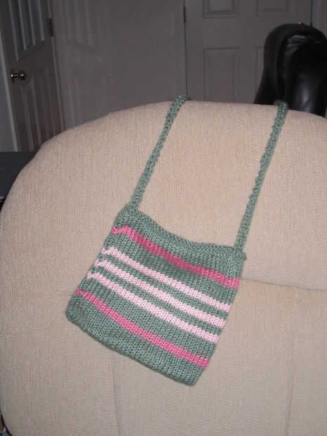 este es un bolso que tejido en agujas circulares de tamaño 8. Es un Jersey básico en todo momento, cambiar los colores para crear un patrón de rayas. Para la correa que hice una fila de doble crochet. Usé hilo rojo corazón Super Saver.