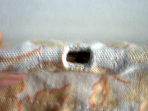 Medir la acabada dentro de la anchura del borde superior, es decir. dentro de las costuras francesas – debe ser alrededor de 33 cm (13"). El pasador debe ser unos ½" más corto que este. Vio a longitud y alise los bordes ásperos con papel de lija. Puesto que dentro de la bolsa – Inserte un extremo en la ranura del buzón en una esquina de la parte inferior, luego deslice el otro extremo a través de la ranura y debe ser capaces de conseguirlo muy fácilmente en su lugar. Coloque el borde superior con un espacio igual en cualquiera de los extremos y marcar a través del agujero de colgar a la madera con un lápiz. (Esto es mejor que sólo marca el centro de la espiga, en caso de que el agujero de colgar en el bolso no terminó precisamente en el centro). Retire el pasador y hacer un agujero en el punto marcado con el punzón o el pequeño taladro de madera, con el objetivo de la línea central de la espiga. (Si su gancho tiene un punto en el extremo del tornillo, esto puede no ser necesario.) Atornille el gancho hasta que quede apretado y apuntando perpendicularmente a la longitud de la espiga. Poner la clavija en la bolsa como antes, deslizando la punta del anzuelo a través del orificio hacia la parte posterior de la bolsa. Voila!
