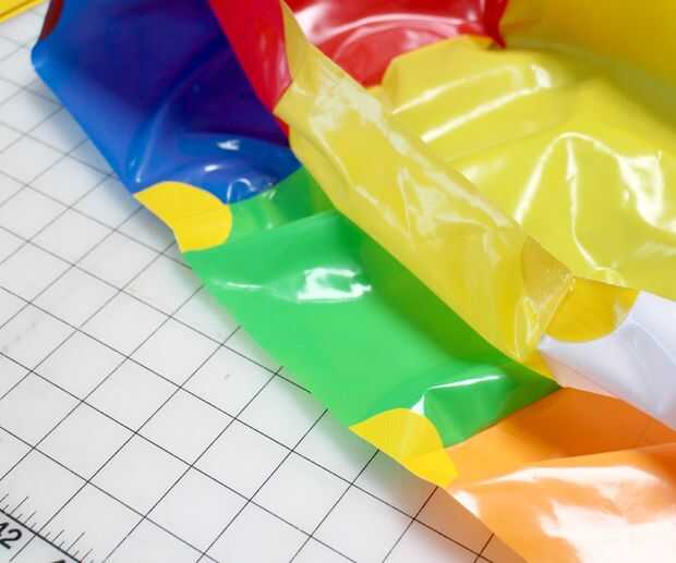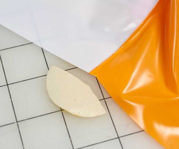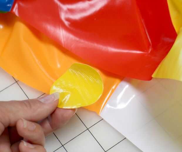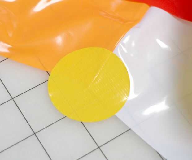 En el interior cortar el borde de la bolsa, pegue un círculo de cinta de ducto en cada uno de los lugares donde encuentran dos secciones de color, seis en total. (como en la foto superior)