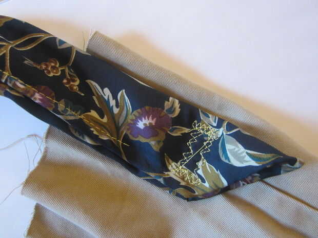 Coloque el extremo más estrecho de la corbata en la costura donde usted lo desee (para mí, dos pulgadas por debajo del borde superior). La correa debe quedar planos la pierna del pantalón cuando esté cosiendo.