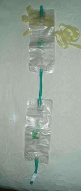 Le conecte el catéter al puerto en la parte superior de la bolsa superior. La orina gotea en, será gravedad alimentada a la segunda bolsa, luego la superior.