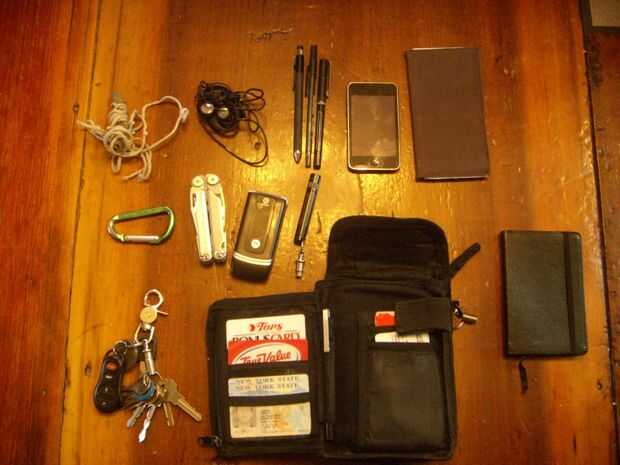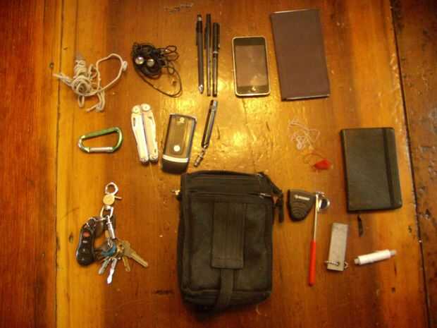 En la bolsa principal, guardo un cuaderno moleskine, mi Honda (que también podría ser cosechado es cadena), mi chequera, una linterna (enganchado a la otra anilla en D) y mi iPod.