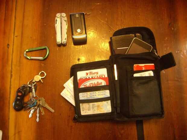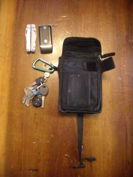 En la bolsa delantera de mis posibles es mi Leatherman y mi teléfono. Puedo sacar estos sin abrir nada.