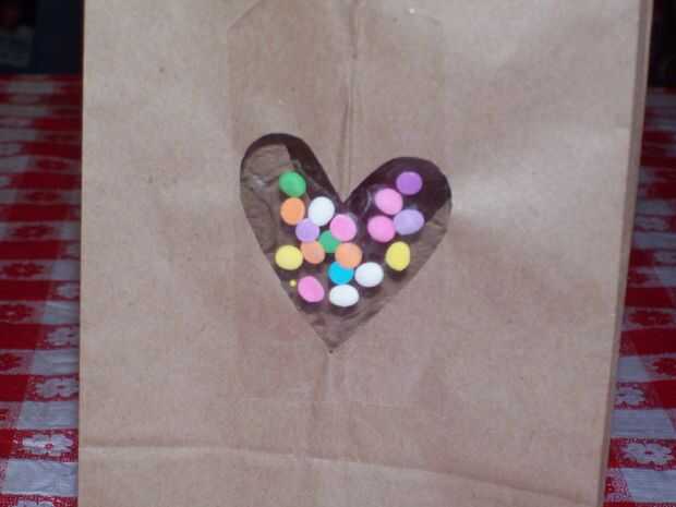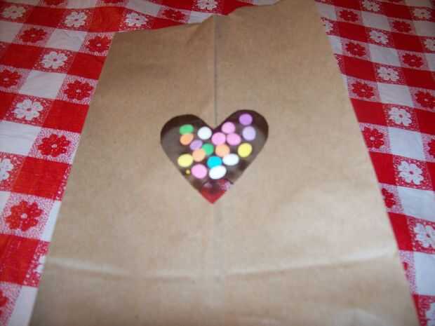 ponga una tira de cinta de embalaje en el interior de la bolsa asegurarse de que es tan amplia como el corazón, poner algunas salpicaduras en la cinta desde el exterior de la bolsa de la marca que son planas, luego poner otro pedazo de cinta adhesiva en el exterior para hacer un bolsillo con el picado en ella. entonces hacerlo a pleno en el otro lado