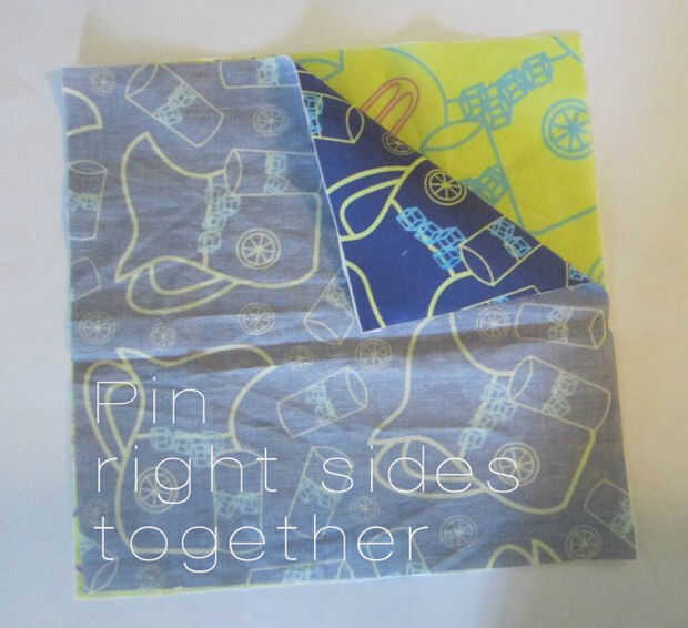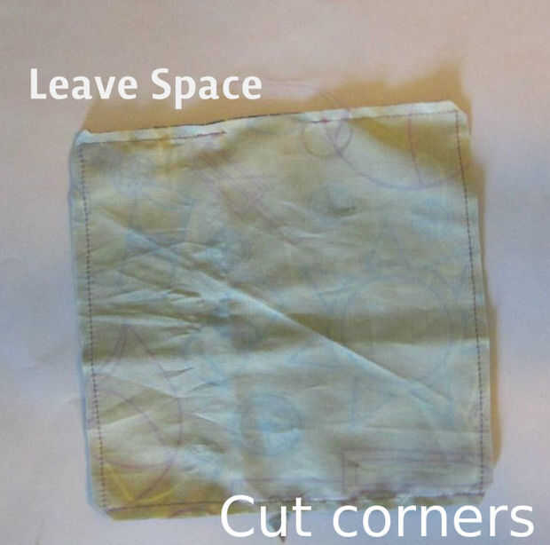 PIN los lados del derecho juntos (para que las piezas impresas bastante cara y se enfrenta a la "parte posterior" de la tela hacia fuera del perno). Coser alrededor de 1/4 de pulgada del borde. Generalmente termino con demasiado espacio entre la costura y el borde de la tela. Eso está bien. No necesita ser perfecto. Sólo recortar el extra después de que haya costura. Asegúrese de que dejar espacio que no es para que usted puede dar vuelta derecha hacia fuera después de coser. Además, las esquinas ven mejores si usted cortar las esquinas como se muestra antes de lado derecho hacia fuera.