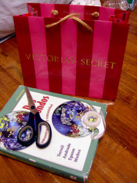 Fuentes: libro, bolso de compras, cinta, tijeras
