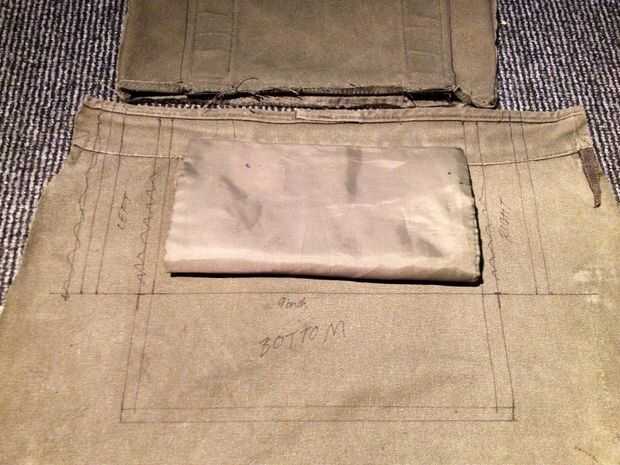 decidí copiar el patrón original de la bolsa pero a una escala mucho menor. Más o menos marcado mi patrón elegido usando una pluma de mercado y que mide dos veces todos! Como se puede ver que yo había hecho varios errores de medición que tuvo que ser ajustado. Como quería mantener la cartera arriba dobladillo grueso hice el panel frontal de una pieza separada del material de la fachada original de la bolsa. Esto ahorra tiempo y releva la necesidad de más tiempo con la máquina de coser. Tenga en cuenta los ajustes de bolsillo interno.
