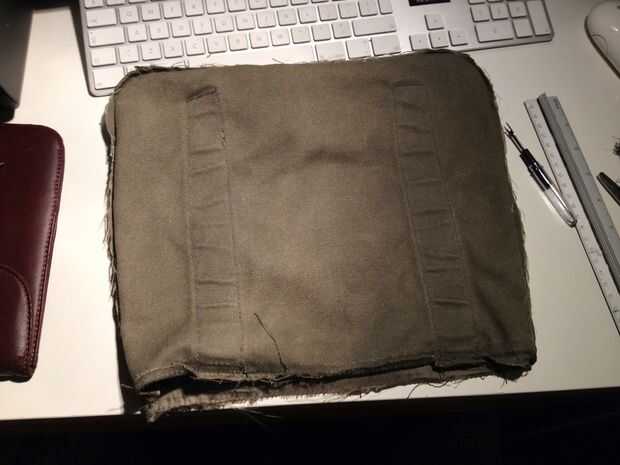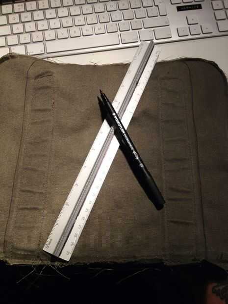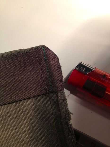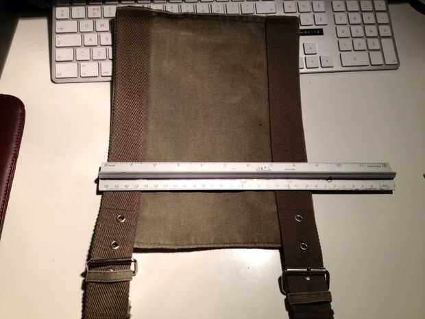 La bolsa debe estar en menos de 8 pulgadas de ancho ya que es el tamaño de mi bomba mini (y botella de agua). Por suerte las correas de la bolsa original eran exactamente la anchura correcta aparte. Yo aún la parece y el revés lo completamente. Esto permite que el recién cosido parece oculto tras el. El material acrílico de las correas de la hebilla era fácil de dobladillo usando un encendedor para derretir el borde.