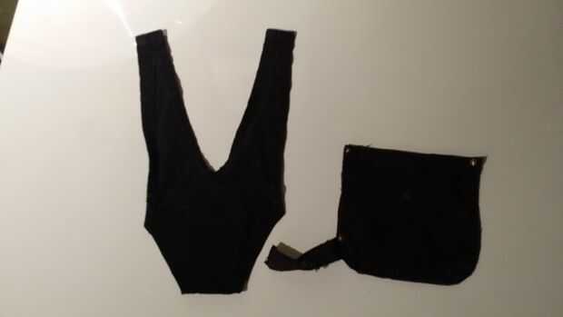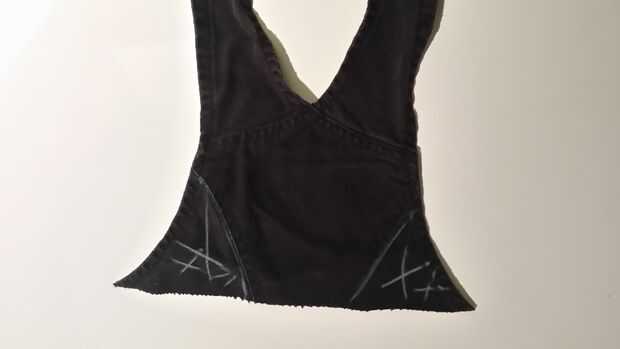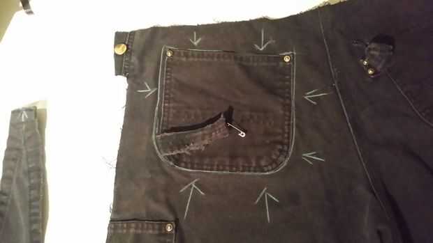 Plan de las piezas que desea utilizar. Usé un bolsillo trasero y las sobras de las correas de hombro. Esto es lo que me quedé con.