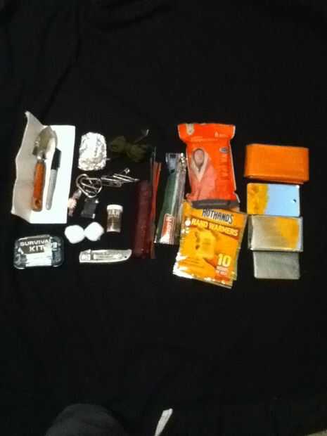 Tienen el engranaje de la supervivencia derecho si Haz dado vuelta alrededor. Llevar en tu mochila un cuchillo, haciendo productos linterna/resplandor palos, cuerdas, mosquetones, papel/sharpie, manta de supervivencia/s, espejo de señales, cinta, kit de supervivencia en una lata, papel de aluminio aislante, vela, zip lazos, caramelos de menta, baterías adicionales, calentadores de la mano, paleta de fuego.